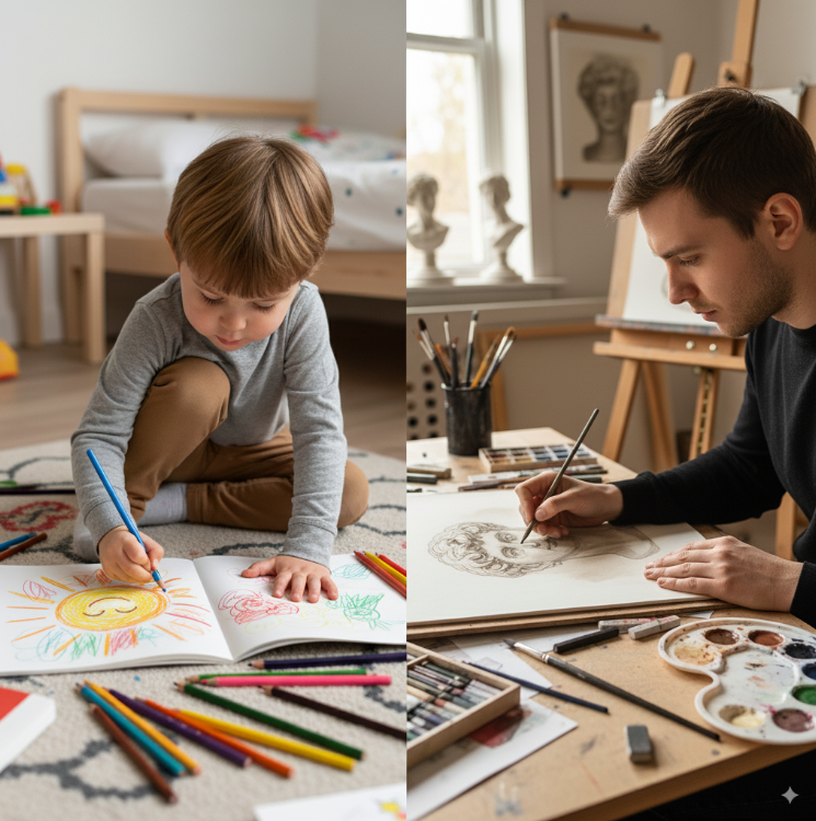 لوازم هنری کودکان باید متفاوت از ابزار بزرگسالان باشد. مداد رنگی نرم، ماژیک غیرسمی و دفتر رنگآمیزی برای کودک مناسب است، در حالی که یک هنرجو به مداد طراحی حرفهای یا مرکب نیاز دارد.